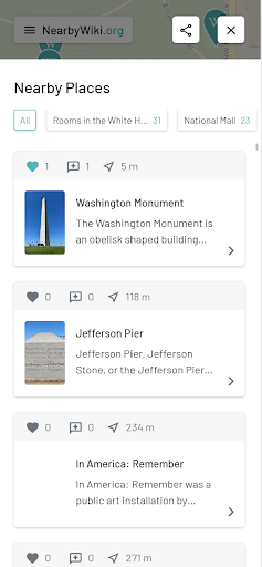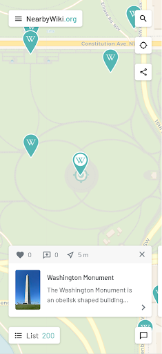 Pinpoint your location and navigate past significant attractions in your area in map view, or browse nearby places listed on Wikipedia in list view.