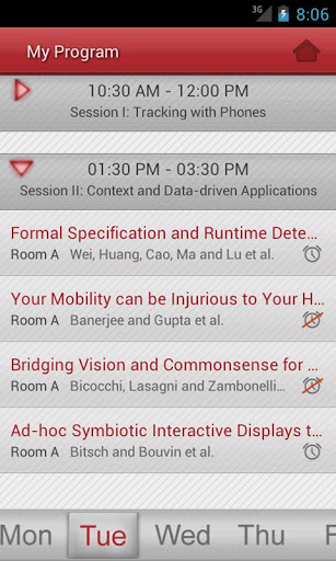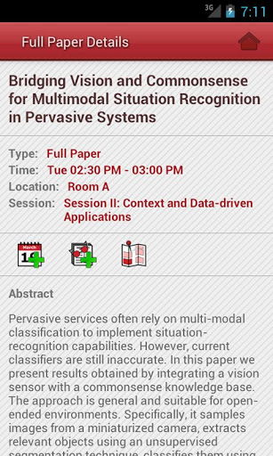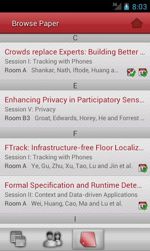 Comfortably organize your personal conference week with your Android device, aided by this application. Browse through conference sessions, papers and participating people, getting additional information where available. Add papers to your personal reading list for later reference. Add events to your personal program and set up alarms where desired. Look up quickly where and when the next session will take place.