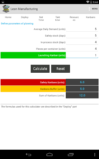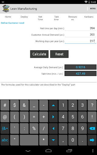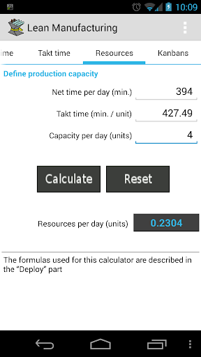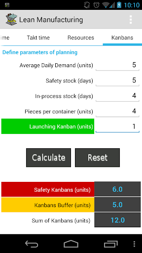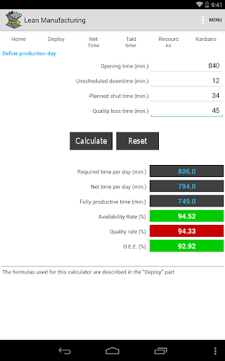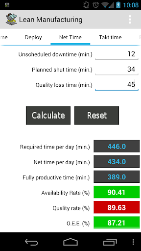 ★ Calculate easily major indicators of Lean: Required Time, Net Time, Fully Productive Time, Availability Rate, Quality rate, OEE Overall Equipment Effectiveness, Average Daily Demand, Takt time, Resources, Kanban.