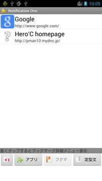 You can start application, display bookmark, and can copy fixed phrase, quickly, if you use "Notification One" like this.