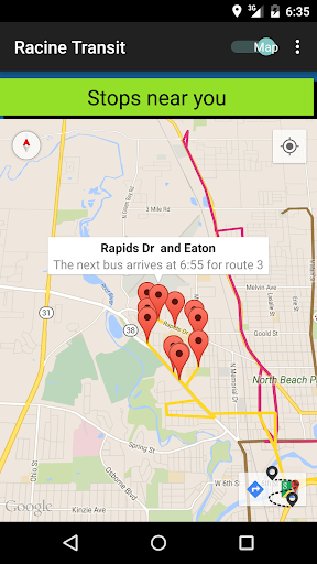 The purpose of the BUS application is to provide navigation around Racine, using the Racine buses. By using the route function and entering a start and end address, you can get a detailed description of how to get where you want to go using Racine buses. By using black and white QR codes found on bus stop signs and scanning them with the BUS application, you can get a list of the routes, times, and directions of buses coming to that stop. The Near me function displays a list and a map of all stops near you.