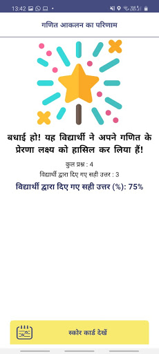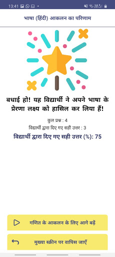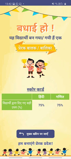In order to use the application, simply select the class and subject(s) you wish to test the child on, and begin the test! After completing the test, students who have achieved their class relevant Prerna Lakshya competencies are celebrated as Prerak Balak/ Balika. In case the student has not achieved the Lakshya competency, they are encouraged to continue practising and take the test again!