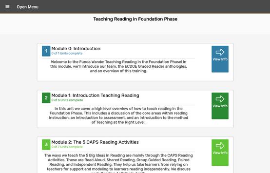 Funda Wande is a world-class multimedia course to teach Foundation Phase (Gr R-3) teachers how to teach reading. Partnering with literacy experts and South African universities, the Funda Wande reading course will be the first of its kind in South Africa. All materials will be made available for free (Open-Access) to all South African teachers. Funda Wande will also include on-going coaching for teachers. Those teachers who successfully complete the course and pass the final assessment will earn a SAQA-accredited Certificate in Teaching Early Grade Reading.