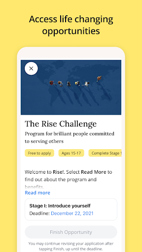 The featured opportunity is Rise: a program that finds brilliant people who need opportunity and supports them for life as they work to serve others. The program starts at ages 15–17. It lasts a lifetime through scholarships, mentorship, and a global community.
