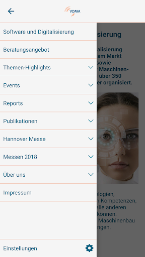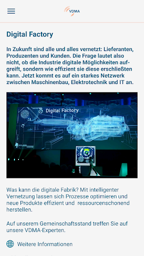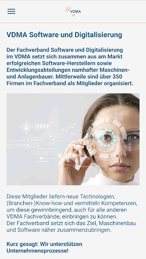 Diese App beinhaltet Informationen des VDMA Fachverbands Software und Digitalisierung zu aktuellen Trendthemen der Digitalisierung im Maschinenbau, Softwaretechnologien, zu Arbeitskreisen und unterschiedlichen Events. Die App beinhaltet außerdem aktuelle Aktivitäten des Fachverbandes auf verschiedenen Messen (Hannover Messe, sps ipc drives, AMB) mit Informationen zu einzelnen Podiumsdiskussionen und Foren. Dies wird unterstützt durch integrierte Kurzumfragefunktionen sowie vom Anwender einzurichtenden Push-Nachrichten zu individuell bestimmbaren Themengebieten.