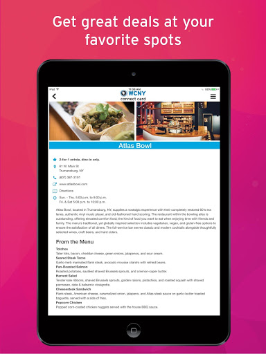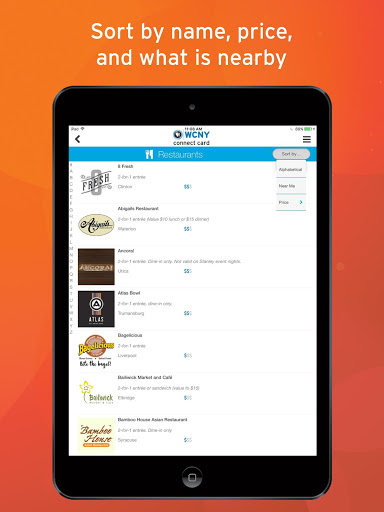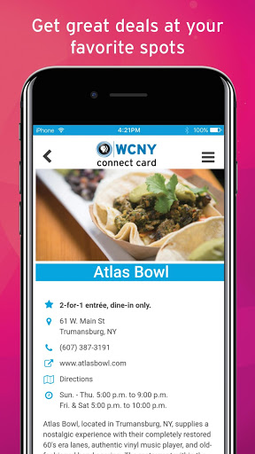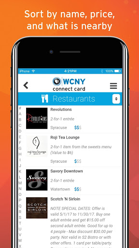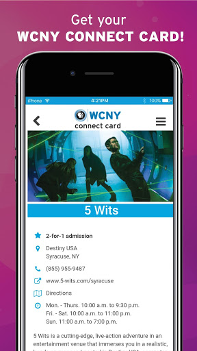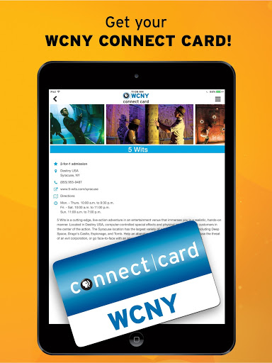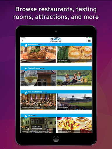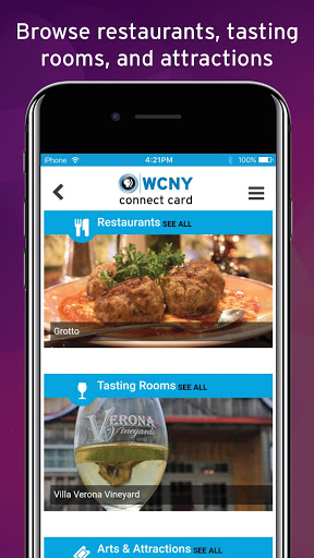 The Connect Card App provides the latest information about the restaurants, wineries, and attractions included in the WCNY Connect Card member benefit program. With the app, you can see the most current list of Connect Card offerings and a detailed description for each provider including specific benefits such as a 2-for-1 dining or admissions discount. The app also allows you to sort the listings and find those closest to your location. The listings will be updated whenever you open the app, as long as your device is connected to the internet. Download the app to get the most enjoyment from your Connect Card discounts. Not a member? Visit wcny.org to become a member and get a Connect Card for yourself!