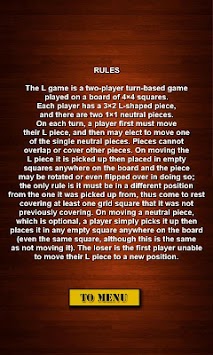 The L game is a two-player turn-based game played on a board of 4×4 squares. Each player has a 3×2 L-shaped piece, and there are two 1×1 neutral pieces. On each turn, a player first must move their L piece, and then may elect to move one of the single neutral pieces. Pieces cannot overlap or cover other pieces. On moving the L piece it is picked up then placed in empty squares anywhere on the board and the piece may be rotated or even flipped over in doing so; the only rule is it must be in a different position from the one it was picked up from, thus come to rest covering at least one grid square that it was not previously covering. On moving a neutral piece, which is optional, a player simply picks it up then places it in any empty square anywhere on the board (even the same square, although this is the same as not moving it). The loser is the first player unable to move their L piece to a new position.
