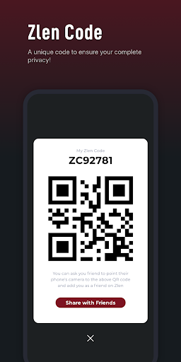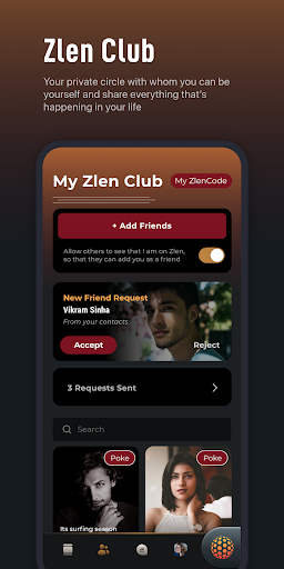 A unique alphanumeric profile code assigned exclusively to you! Choose who becomes a part of your Zlen Club via a unique Zlen Code that you receive when signing up. The Zlen Code works as an entry barrier that keeps out unwanted contacts from entering your private space. Think of it as your personal Digital Bouncer. Without your Zlen Code, it is impossible for anyone to find you on the app. You are the Boss of your own space, so it is up to you to accept or reject the request. And when someone sends you a request, they can only see the code and not the profile it's sent to. So till the time you accept a request, no one really knows whether you exist on the app or not. We told you we are serious about privacy.