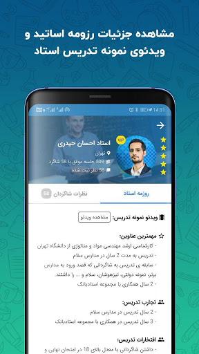 ویدئو نمونه تدریس اساتید: شما حتی می توانید با مشاهده ویدئو نمونه تدریس اساتید در پروفایل شان، به شناخت کاملی از نحوه تدریس و بیان معلم مورد نظر خود برسید.