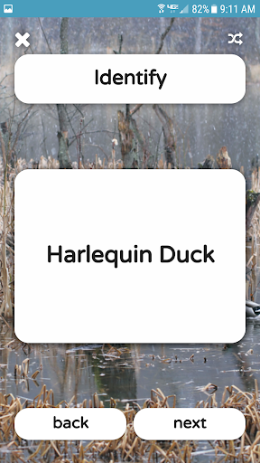 After the information section, we have flashcards. No reinventing the wheel here, just using a tried and true method to learn duck ID. When you open this section, you'll see a photo of a duck. Study it and look for it's distinguishing features and then tap the photo. It will flip the card over and reveal the species. Then click "next" and it'll bring up a new image with a new species. With over 130 flash cards, and more to be added, these are extremely helpful in training your eyes for proper, and quick, duck ID.