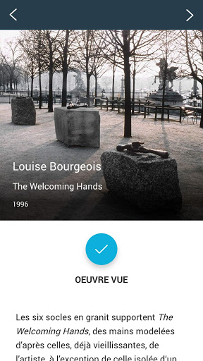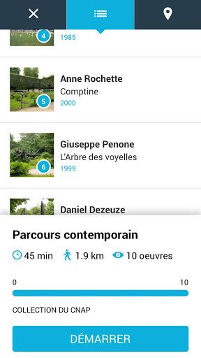 En activant le GPS de votre téléphone, vous pourrez être orienté et guidé pendant votre balade. Suivez le guide pour optimiser votre temps sur place et ne rien manquer. A l’approche d’une œuvre, accédez à des cartels multimédias pour tout savoir sur l’œuvre dans ses moindres détails (textes, vidéos, photos, sites internet etc.). Obtenez votre bilan de visite et votre progression sur les différents parcours. Retrouvez tous les contenus et informations relatives aux œuvres après votre visite, grâce au mode de consultation en liste.