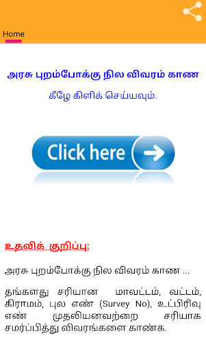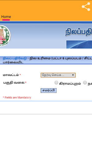 * நில உரிமை (பட்டா & புலப்படம் / சிட்டா/நகர நில அளவைப் பதிவேடு) விவரங்களை இணைய வழி காண்க.