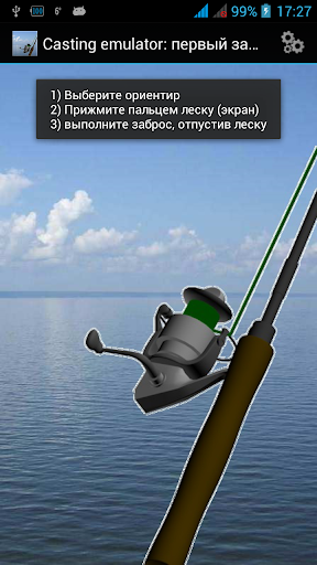 3) Для забросов удилищем с безынерционной рыболовной катушкой - нужно обязательно придерживать леску пальцем (касаться экрана в приложении), и при окончании замаха удилищем - леску надо отпускать, чтобы оснастка улетала в водоем (т.е. палец от экрана надо убрать)