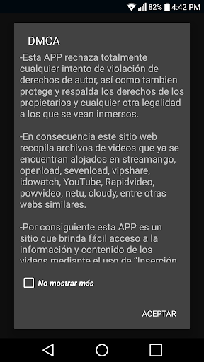 -La aplicacion no sube ni almacena en su sitio o servidor, cualquier archivo de película, videos, archivo multimedia en ninguno de sus tipos (avi, mov, flv, mpg, mpeg, divx, mp3, mp4, mkv, torrent, iPod, PSP) o cualquier otro tipo de material que se encuentre protegidos por derechos de autor.