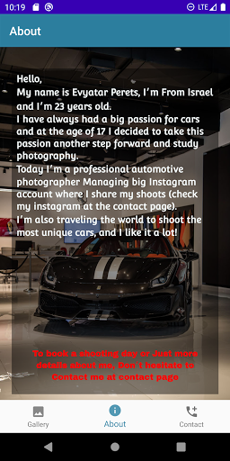 Cars Gallery is an app that contains a variety of high-quality images of special vehicles taken by Me, Evyatar Perets - Known also in instagram as PeretsCarStyle - a professional automotive photographer.