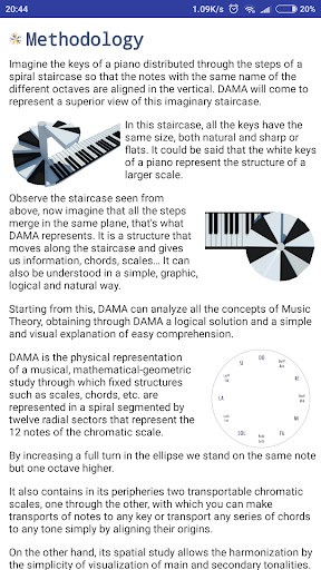 We consider that DAMA is mainly a practical handbook, through which the musician, both professional and beginner, will be able to understand and obtain in a very simple way a large part of the musical theory, and access it, in a direct way, to working formulas (chords, location, transport, modulation, etc.).