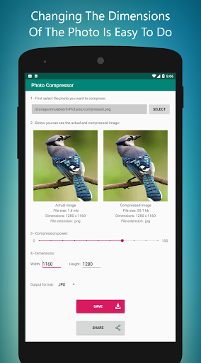 When you insert your photo into the Reduce Photo Size app, all you have to do is determine the amount of compression. Then you can save your photo.