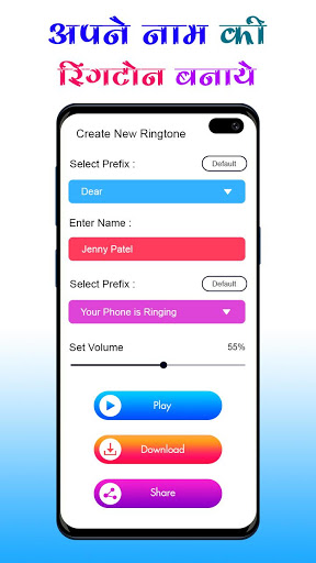 Make special and beautiful ringtones with given text or you may choose from default text. My Name Ringtone Maker is the best app for making name ringtone as your favorite caller tune. Favourite name become part of your caller tune, when call comes then your name caller tune will speak and play.
