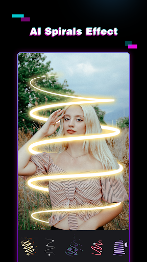 Picslip photo editor give your many kinds of colorful spirals, different kinds spirals will give your different style. Neon spirals make your portrait more dynamic, drawing spirals make your photo more artistic. Spirals combine with the music in templates make you story much more cooler.
