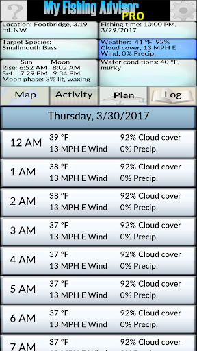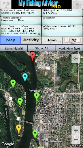 Build your own collection of fishing spots and My Fishing Advisor will help you pick which ones are most promising at a given time. It will help with lure selection, and even details like the most appropriate rods, line, hook sizes and sinker weights. Beginners use My Fishing Advisor to take the frustration out of learning to fish and to find success much faster. Experts use My Fishing Advisor to find patterns they might otherwise overlook and to find and catch fish more consistently.