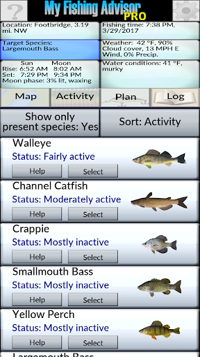 Like a fishing guide this app will consider many factors that affect fish behavior in order to predict where they will be and how actively they’ll be feeding. This freshwater fishing guide supports bass, sunfish, crappie, perch, walleye, catfish, trout, salmon, pike and musky.