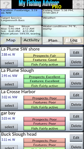 Build your own collection of fishing spots and My Fishing Advisor will help you pick which ones are most promising at a given time. It will help with lure selection, and even details like the most appropriate rods, line, hook sizes and sinker weights. Beginners use My Fishing Advisor to take the frustration out of learning to fish and to find success much faster. Experts use My Fishing Advisor to find patterns they might otherwise overlook and to find and catch fish more consistently.