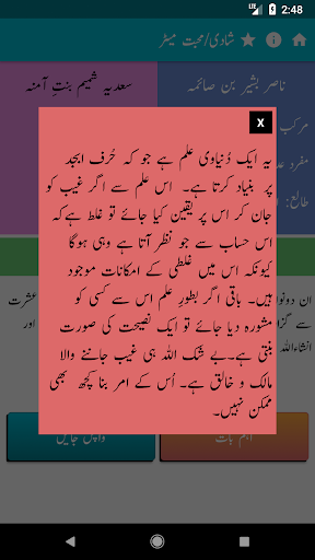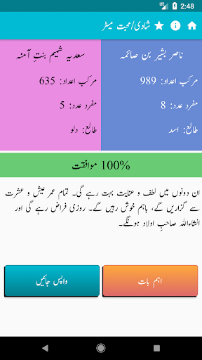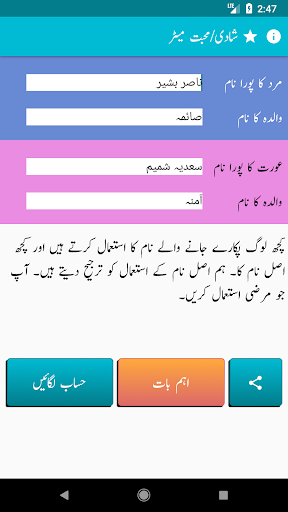 This app is very useful as marriage/love meter. You can test that how will be the behavior of two mates after marriage. All calculation is based on Huroof Abjad, which is widely used for predictions. In Arabic language, every alphabet allotted numerical value known as the Adad of that letter. The calculation of this is called Abjad Calculations or Hisab'ul Jumal. On the basis of these value, the Zodiac are derived and matching has been made. These all calculation are based on Kash al Barni’s recommended formulas.