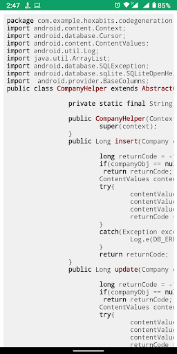 “Android Code Generator” aimed to solve the problem of the android developers relating to Database creation, optimized code of database operations. This app facilitates the developer to create database visually which is not available yet by SQLite. This application would be helpful to the android developers to save their time while doing rapid code writing related to database.