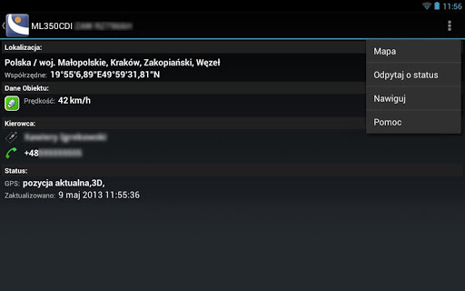 > Dokładnej lokalizacji pojazdu wraz ze współrzędnymi geograficznymi,