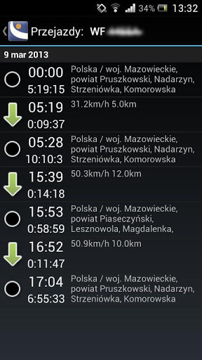 - Wyświetlenie raportu przejazdów i postojów za okres ostatnich 3 miesięcy,