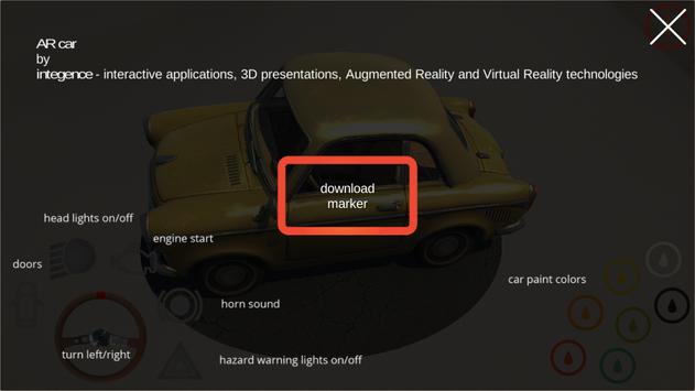 AR car application shows car 3d model on the printed marker. You can open/close the doors, turn on the headlights and the hazard lights, start the engine and use the horn button, turn the front wheels right and left, change the car paint color.