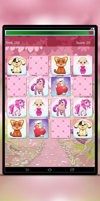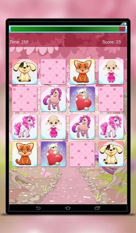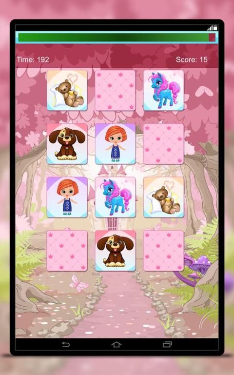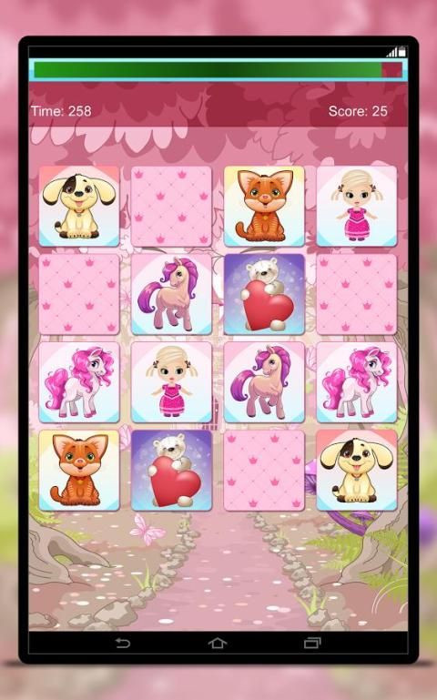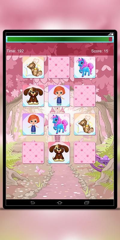 Let your child for memory training with beautiful designed cards with images of ponies, unicorns, baby dolls, teddy bears and pets. Beautiful pink pony, cute blue pony, charming unicorn, pretty baby doll, nice brown teddy bear, cute kitty and doggie, included in one, free game! Don't wait! Download now! It's free!