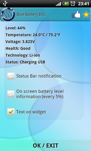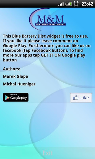 Free battery indicator with great looking layout.Blue Battery Disc is a free battery indicator what you can set on your home screen as beautiful widget. Widget contain configuration menu. You can set from there some cool options to fit this widget to your needs.To add this widget to you home screen:1. tap and hold on free space2. chose Add Widget3. tap on Blue Battery Disc4. That is all, enjoy :Tap on Blue Battery Disc to get more battery information Above it, you can find facebook button and follow us, and when you press at star, there is a link to Google Play where you can give us some opinion. Below additional battery info you can find check box. You can set there:1. Battery level information in notification bar.2. On screen info every each 5.3. Battery level text on widget.4. Check where you are most use batteryThis free battery indicator is really lightweight and does not drain battery. Check other apps from Mamp;M Software Development. Widget have some useful features like: High Definition layout HD Onscreen info about current battery level, every 5. When you play games or browsing websites you can control when your battery is discharged. Info in notification. When you write sms, email using facebook listening to the music or anything else you have current battery level in notification bar. When press on Widget icon you can get more battery information like: temperature voltage, health, technology and current status.This free app is ad supported and may contain ads in the notification tray.