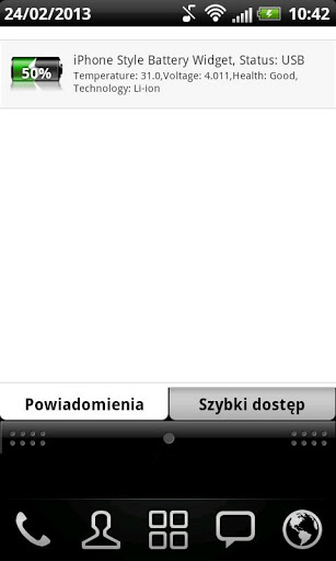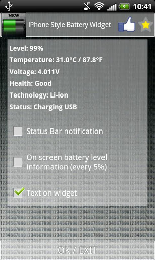 Simple and classic battery widget for your phone. This battery looks like battery on iPhone lock screen. Green fill of our battery can show you current status of your phone's battery. And when battery level is low battery will be red and warning you that you need to charge your phone immediately. This battery is simple and great so you can quickly check how much battery left. Battery with a classic design fits not only the business people. Download it for free.To add this widget to you home screen:1. tap and hold on free space2. chose Add Widget3. tap on iPhone Style Battery Widget4. That is all, enjoy :)Tap on iPhone Style Battery Widget to get more battery information Below additional battery info you can find check box. You can set there:1. Battery level information in notification bar.2. On screen info every each 5%.3. Battery level text on widget.This free battery indicator is really lightweight and does not drain battery. Widget have some useful features like: - High definition (HD) layout.- On-screen info about current battery level, every 5%. When you play games or browsing websites you can control when your battery is discharged.- Info in notification. When you write sms, email using facebook listening to the music or anything else you have current battery level in notification bar.- When press on Widget icon you can get more battery information like: temperature voltage, health, technology and current status.This free app is ad supported and may contain ads in the notification tray.Support - M&M Software DevelopmentIf you need help with our battery widget please contact with us on email: mm.software.development@gmail.com Our support works only in the English language. Please contact us in this language because we will solve your problem easier.Comments and rating:If you want to help other users find our applications please leave comment and positive rating.Before posting negative opinion please contact us. We can solve your issue in most cases and you will be happy using our applications without problems. Our other applications:Heart Battery HD Widget 2x2Sport Car Fuel Gauge BatteryLove Battery WidgetAdvertising:This free application is ads supported. Ads may show in notification tray and / or your smartphone home screen. Permissions are for ads.Other battery widgets and much more from M&M Software DevelopmentFull list of our applications is available by clicking our developer name on Google Play.