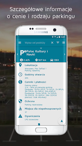 Szczegółowe opisy parkingów zawierają m.in. informacje o cenie za postój, dokładny adres i typ parkingu, godziny otwarcia, rodzaj ochrony czy pojemność. Wyniki wyszukiwania możesz filtrować według zadanych kryteriów, a po wybraniu na mapie dowolnego parkingu możesz szybko ułożyć trasę do niego za pomocą Twojej ulubionej aplikacji do nawigacji.