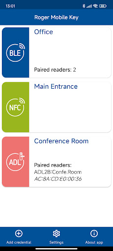 Roger Mobile Key is an app for mobile device which enables user identification in RACS 5 access control system and RCP Master 3 Time & Attendance software. The transmission between app and terminal can be conducted through BLE (Bluetooth), NFC or QR code displayed on mobile device screen. In case of BLE identification the mobile device can communicate in a distance of a few meters so this method can be used at driveways and gates to avoid user stepping out of the car for the purpose of identification.