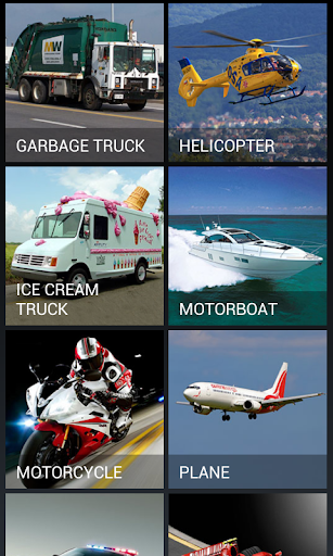 Sounds of the vehicles with pictures. Fun for kids. You can find these sounds in the application: - Ambulance - Fire Truck - Helicopter - Ship - Bicycle - Ice Cream Truck and many others.