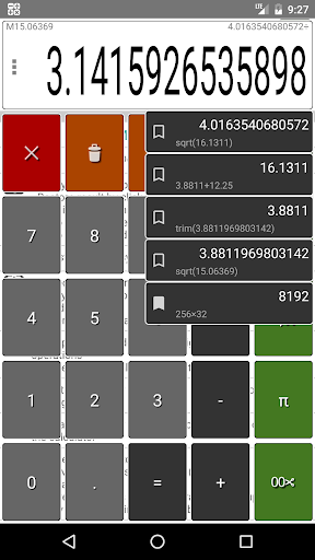 • Much more math (sin, cos, tan, arcsin, arccos, arctan, sinh, cosh, tanh, square, cube, x powered y, exponent, power of ten, square root, cube root, x root y, natural logarithm, common logarithm, 1 over x, factorial, round half from zero, round down, π)