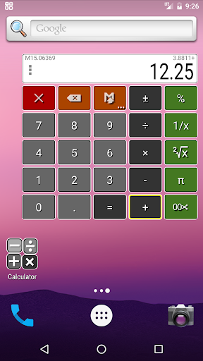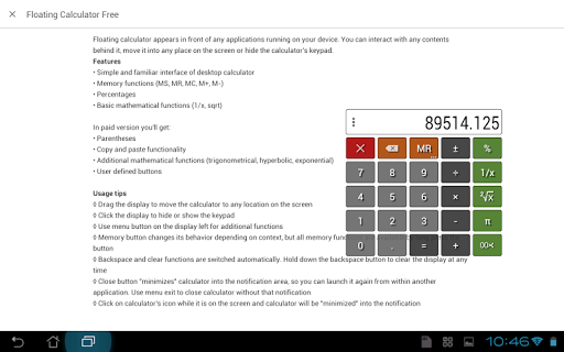 The calculator appears in front of any application running on your device. You can interact with any contents behind it, move it into any place on the screen or hide the calculator's keypad.