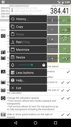 • Use menu button on the display's left side for additional functions (make the calculator fullscreen and transparent, set its size, hide green buttons, switch haptics)