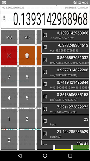 • Mathematical functions (trigonometrical: sin, cos, tan, arcsin, arccos, arctan; hyperbolic: sinh, cosh, tanh; exponential: square, cube, x powered y, exponent, power of ten, square root, cube root, x root y, natural logarithm, common logarithm, 1 over x; other: factorial, round half from zero, round down, π)