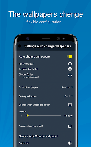 An automatic wallpapers change function (live wallpapers) is implemented in the application. You can choose the source and interval of changing yourself. Just add backgrounds to the favorites, tick the corresponding settings option and enjoy. You can change the wallpaper when using any launcher. Now, all the HD wallpapers you like will rotate on your desktop and lock screen!