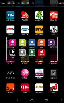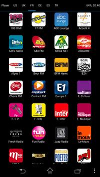 It contains a good variety of internet radio stations from the United State (US), United Kingdom (UK), France (FR), Bretagne (BZH), Germany (DE), Turkey (TR) Spain (ES), Brazil (BR), Sweden (SE), Italy (IT), Poland (PL), Ireland (IRL), and Austria (AU). More than 400 streaming stations are available and more can be added under request. The top 20 is available for each country. Some radios include BBC radio, Absolute, Planet Rock, CBS news, 181.fm, .977 music, France Inter, France Info.
