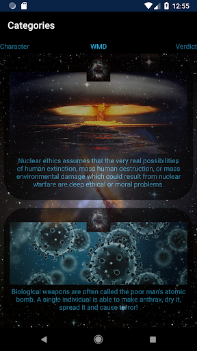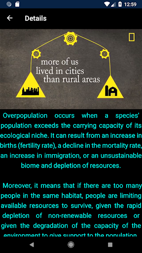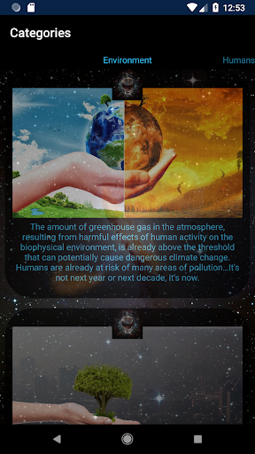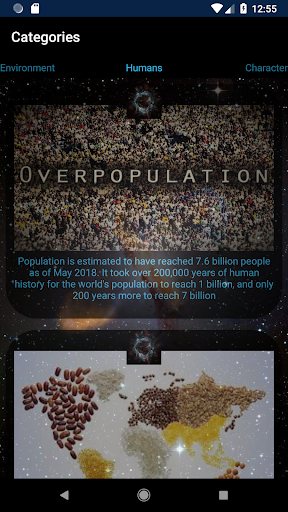 The main purpose of this app is to shed light on some of earth's urgent problems that are a direct result of human interference. It starts with a small introduction of aliens consulting an interstellar AI application on earth being a good place to spend their vacation on followed by displaying relevant info for their inquiry and a verdict..