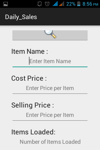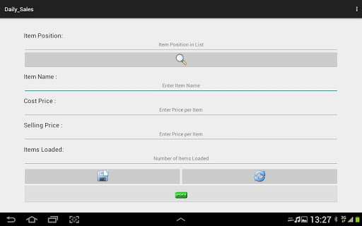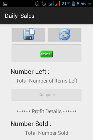 The daily sales section accepts item's name, cost price, selling price, and the total number loaded for sales. These information are saved and can be viewed in the sales list on the app's menu. In determining profits on items sold, item position number is checked from the sales list which is then used to query the items details that activates a compute button. The total number of items left is then entered and upon touching the compute button, the total number of items sold together with the over all amount gained per sales and its profit is displayed to the users.