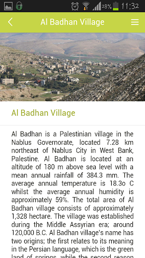 Al Badhan is a Palestinian village in the Nablus Governorate, located 7.28 km northeast of Nablus City in West Bank, Palestine. Al Badhan is located at an altitude of 180 m above sea level with a mean annual rainfall of 384.3 mm. The average annual temperature is 18.3o C whilst the average annual humidity is approximately 59%. The total area of Al Badhan village consists of approximately 1,328 hectare. The village was established during the Middle Assyrian era; around 120,000 B.C. Al Badhan village’s name has two origins; the first relates to its meaning in the Persian language, which is the green land of springs, while the second reason says it named after the Persian commander named “Badhan” who inhabited the area.