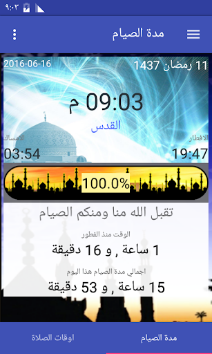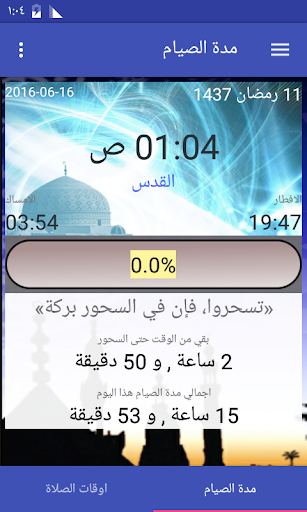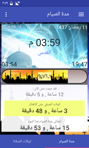احصل على اوقات دقيقة حول مدة الصوم , والوقت المتبقي حتى الافطار اوكم صمت حتى الان , التطبيق ايضا يقدم اوقات الصلاة