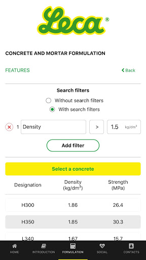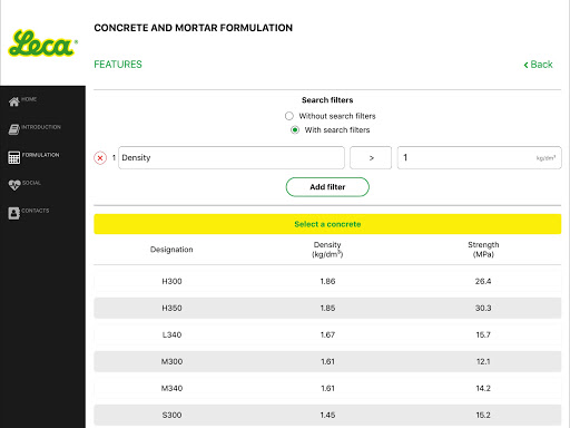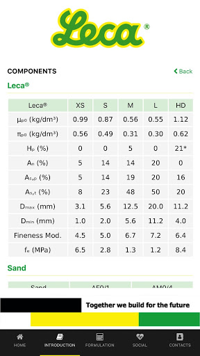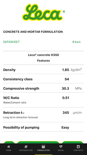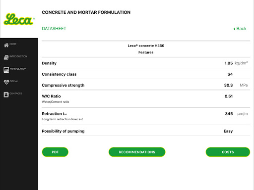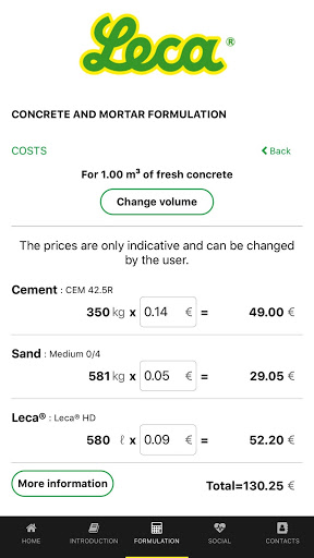 This App is for illustrating how Leca® can contribute to formulating several concrete and mortar mixes depending on usage or necessity, and promptly calculate the mixture's cost.