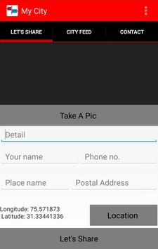 This app is for social cause..We daily face problems like poor road conditions,bad street lightning,open manholes..But whose gonna go to the authorities daily..So here My City comes in.Just take the pic ,fill in some details,and just share it with your people and the authorities...