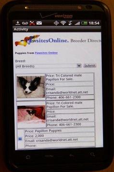 Puppies from http://www.pawsitesonline.com displayed in a phone app. You can search by breed and call and email right from your phone.